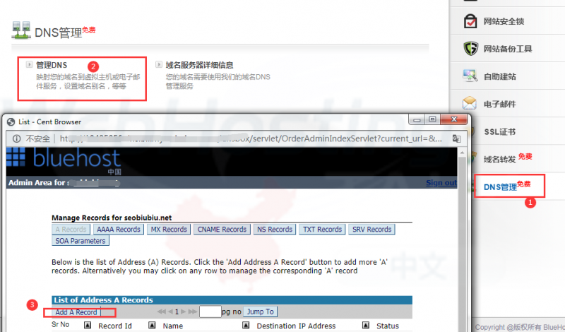 >>>点击右侧的栏目,选择DNS管理,选择管理DNS,进入域名解析页面