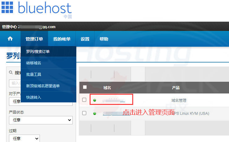 >>>登录主机商后台,点击罗列搜索订单,点击注册域名进入管理页面